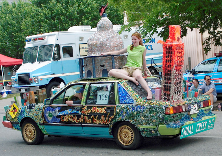 Today's Action Photo is a picture of 2002 Houston Art Car Parade entry #138, an Austin-inspired design featuring a little bat on the top holding a guitar!