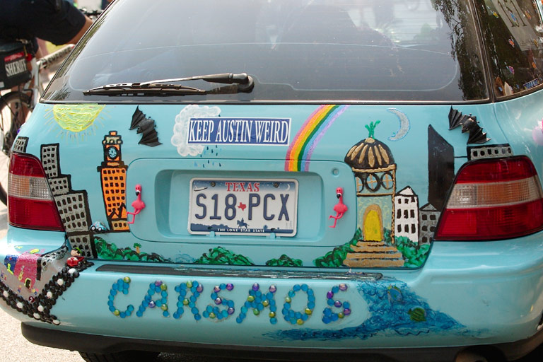 Today's Action Photo is a picture of a car dedicated to Austin, Texas called Carsmos in the 2003 Art Car Parade in Houston, Texas!