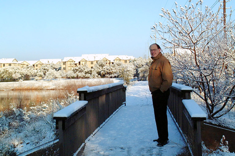 Today's Action Photo is a picture of Dad on a snow-covered bridge at the Reata apartment complex in Austin, Texas after a rare heavy snowfall! Guest photographer: Mom.