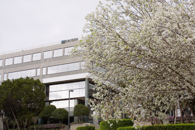 Today's Action Photo is a picture of the Origin building peeking out from behind one of the nicely landscaped white trees along Courtyard Drive in Austin, Texas!