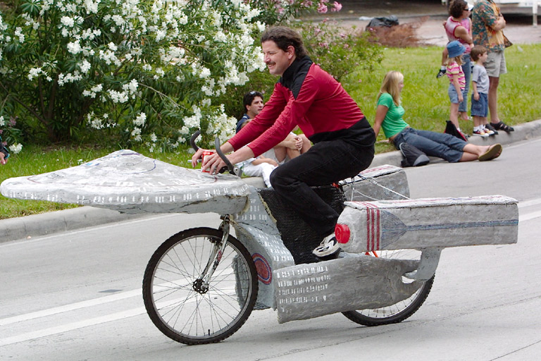 Today's Action Photo is a picture of a guy riding a bicycle made up to look like the Starship Enterprise in the 2004 Everyone's Internet Art Car Parade in Houston, Texas!