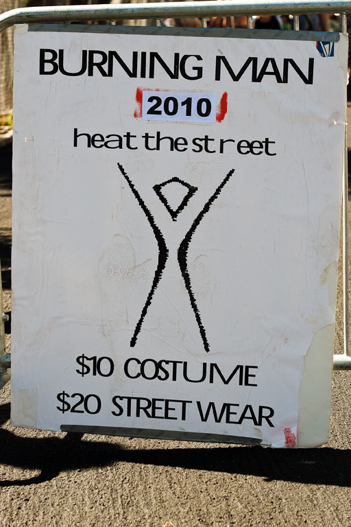 Today's Action Photo is a picture of the entrance sign at the 2010 Burning Man Decompression/Heat the Street event in San Francisco, showing the reason why most people wear costumes!
