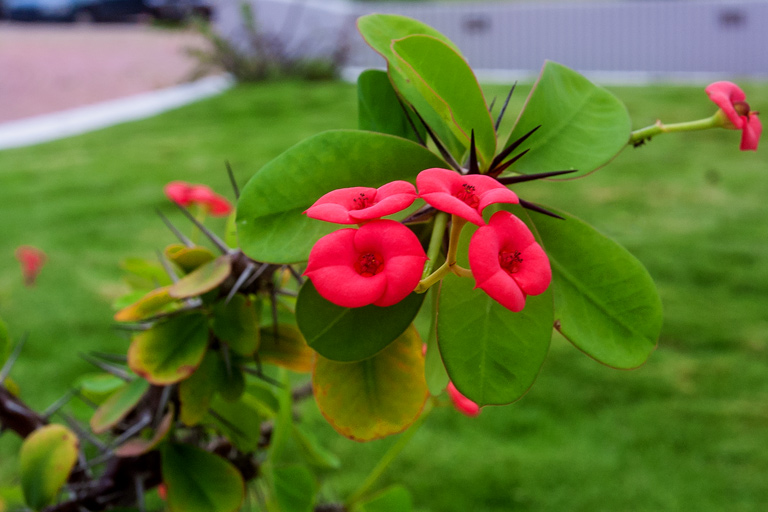 Today's Action Photo is a picture of some small red flowers with giant spiky thorns!