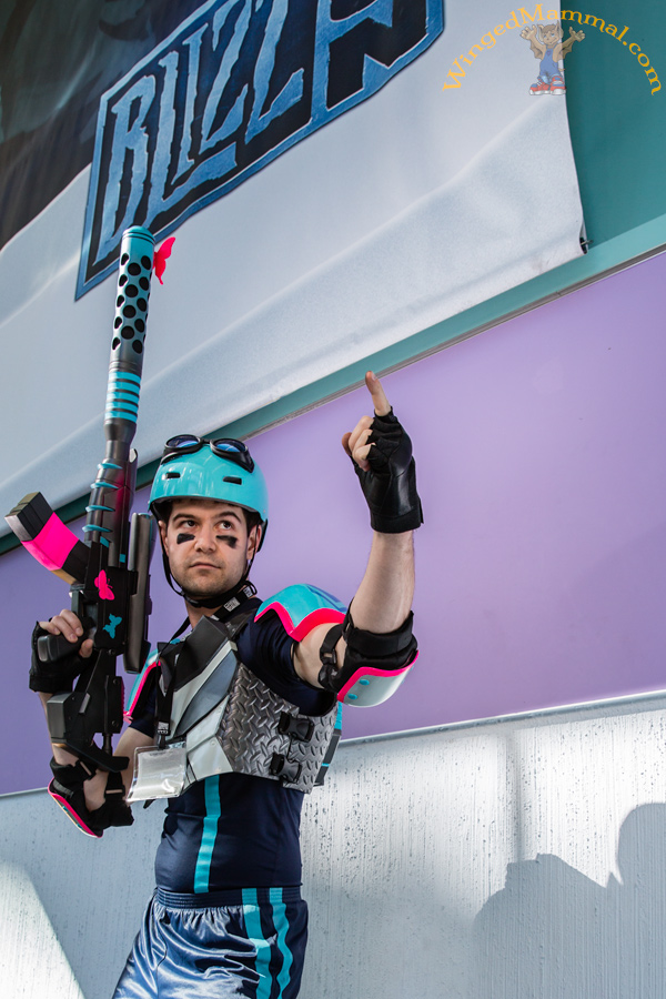This is a picture of Mario from Triple A Cosplay in his cosplay bro version of Roller Derby Nova from "Heroes of the Storm" at BlizzCon 2014!
