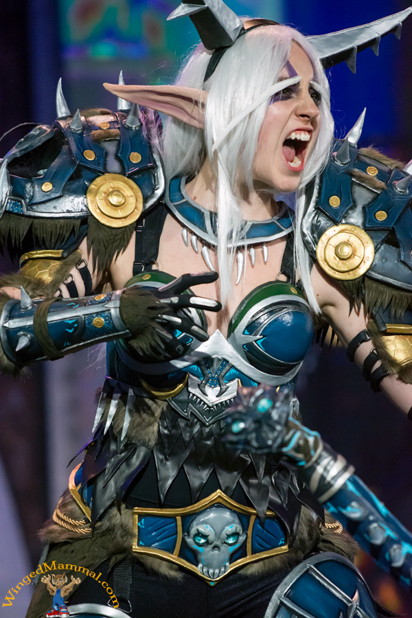 This is a picture of an armored Night Elf (Death Knight?) working the crowd during the costume contest at BlizzCon 2014!