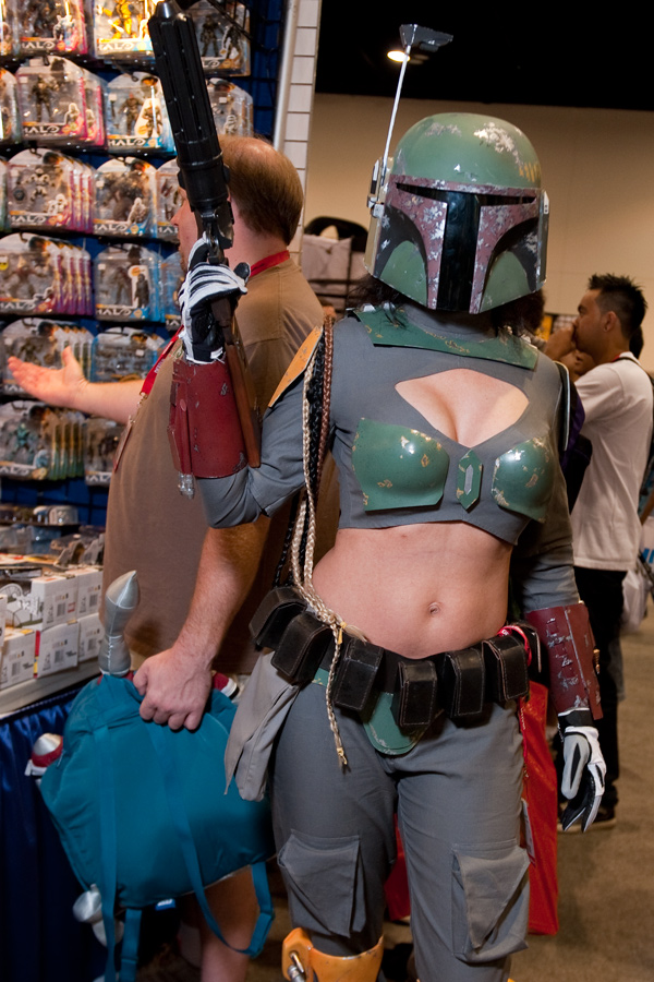 This lovely lady models the Star Wars bounty hunter look, popularized by the movie character Boba Fett!