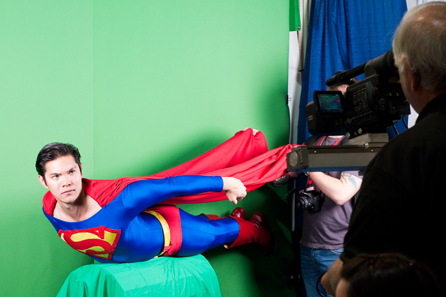 This excellent Superman is getting his photograph taken in 3D by a fancy new camera that quickly takes a picture from multiple angles and then prints it into a special plastic frame that displays different angles as you move your eyes while looking at it!