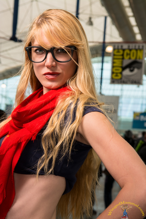 This is a picture of a hipster version of SuperGirl at San Diego Comic-Con 2013! This girl has been featured here before as Juno Eclipse from Star Wars in my lead photo from 2011.