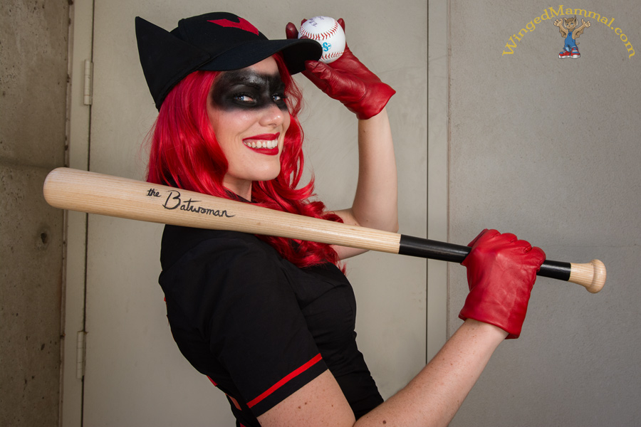 This is a picture of high-profile cosplayer Lisa Lou Who in her Bombshell Batwoman baseball player cosplay for San Diego Comic-Con 2014!