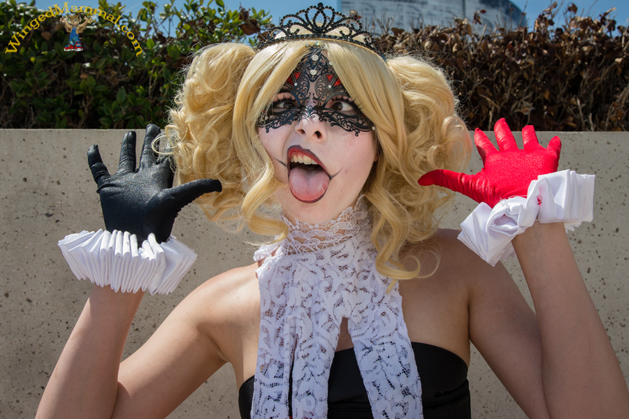 This is a picture of a Harley Quinn cosplayer with a crazy expression at San Diego Comic-Con 2014!