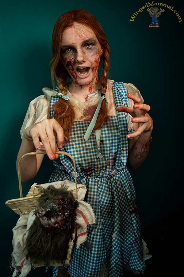 This is a picture of a mashup cosplay of Dorothy and Toto from 'The Wizard of Oz' and zombies at San Diego Comic-Con 2014!