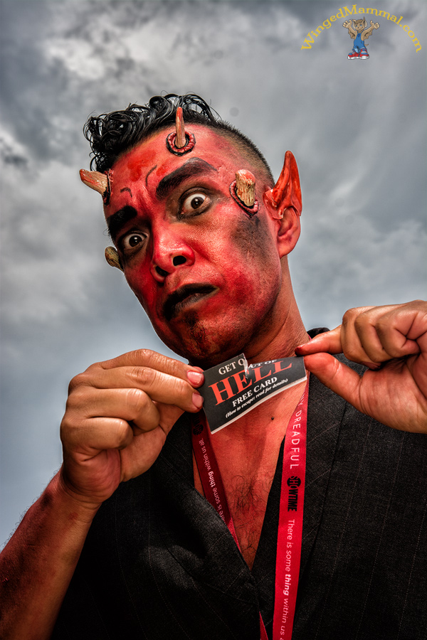 This is a picture of a demonic-looking Zabrak sith from Star Wars tearing up one of the ubiquitous Get Out of Hell Free cards handed out be religious zealots at San Diego Comic-Con 2014!