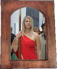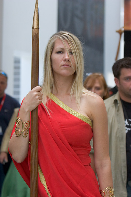 girl (in red) is trying to look aloof, since she's playing a Roman goddess