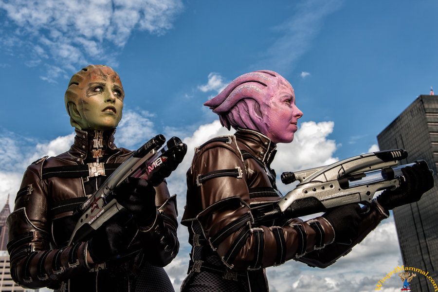 This is a picture of a deadly Asari strike team defending the Mass Effect photo shoot from galactic evil at Dragon Con 2014! These two cosplayers are