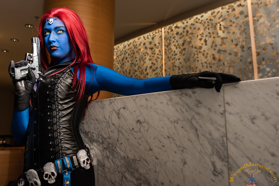This is a picture of a nicely body painted comic-book Mystique in black at Dragon Con 2014!