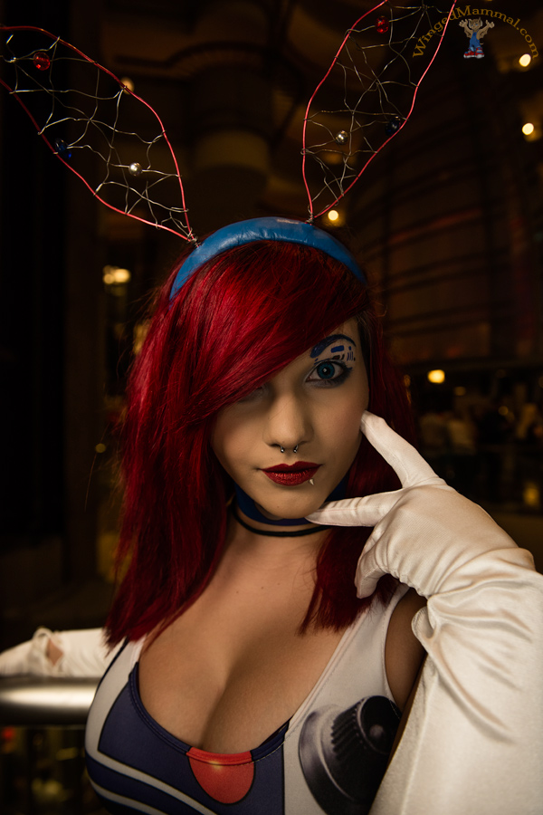 This is a picture of R2D2 from Star Wars as a Playboy Bunny at Dragon Con 2014 during the Bunny Hutch party!