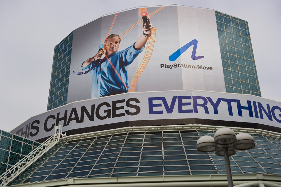 The West Hall entrance was covered with a large banner promoting the new Sony Move controller, in this case simulating a bow and arrow!