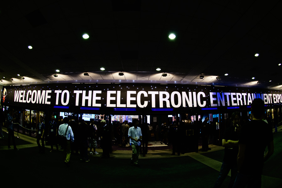 A very wide sign says "Welcome to the Electronic Entertainment Expo" over the West Hall entrance at E3 2011!