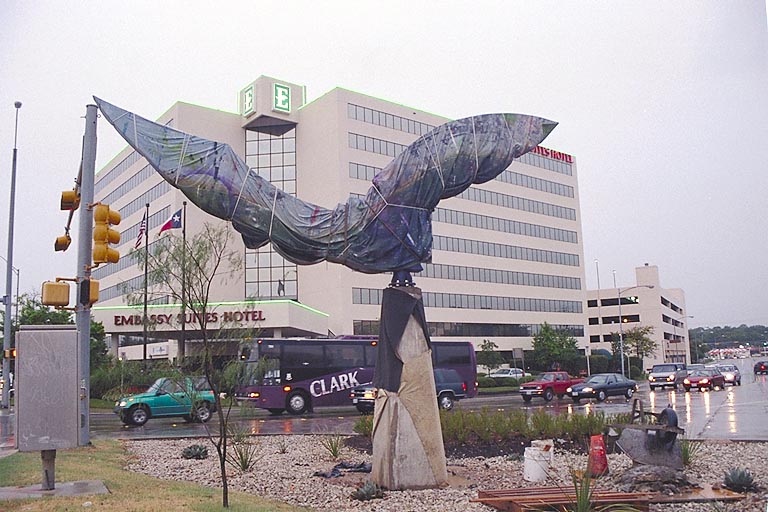 This is a picture of the bat sculpture disguised in a dropcloth prior to its official unveiling on June 12, 1998. This is looking west towards the Embassy Suites Hotel.