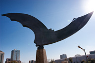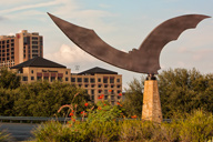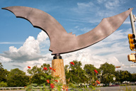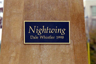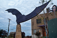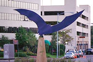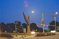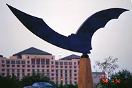 This is a special section of my photo album documenting the history of Austin's new bat sculpture known as "Nightwing" at the intersection of Congress Avenue and Barton Springs Road in Austin, Texas. The sculpture, completed in June 1998, is a metallic bat painted purple with reflective white flecks in the paint. It rotates in the wind, and turns significantly in even a slight breeze, so it might be interesting to go down there while a 60 mile-per-hour storm blows through and watch it spin like a top! Hopefully they've designed it to withstand harsh conditions like that. The sculpture was designed by Austin artist Dale Whistler. The photos begin with the empty traffic island in the middle of the intersection during February and March 1998. Then, in June 1998, the concrete base was poured and a workman finished the exterior of the base. Then, around mid-June 1998, the bat itself was placed on the base, hidden in a dropcloth until the official unveiling the next day. Then, on June 12, 1998, the bat was revealed! Unfortunately, I missed the actual ceremony when they removed the dropcloth, because the exact time of the ceremony was never made public. Anyway, I went down there later and got some good photos of the completed bat. Move your mouse cursor over any of the photos below for a quick summary of the picture's contents. Click on a thumbnail for a detailed view of any picture. These are from the first "Freetail free-for-all" bat viewing event put on by the Austin American-Statesman to celebrate the new bat sculpture. Here are some more bat sculpture photos that I took after I created this page: All content under the domain wingedmammal.com is Copyright © Brent Allen Thale, All Rights Reserved, unless otherwise noted or used under authorization of the copyright owner. |