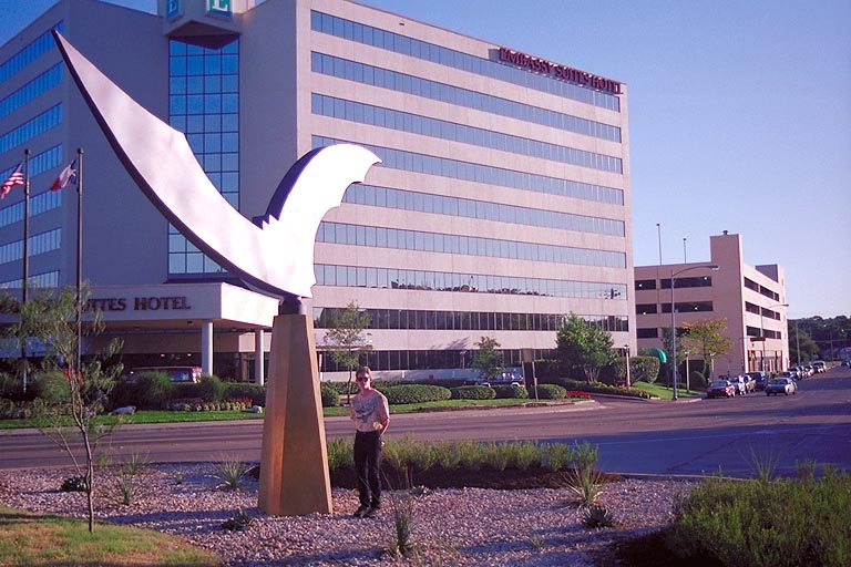 This is a picture of me with the complete bat sculpture on the day of the "Freetail Free-for-all" sponsored by the Austin American-Statesman to celebrate the arrival of the bat sculpture. June 1998.