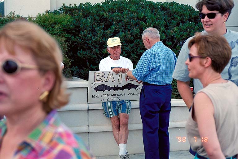 This is Church's Chicken magnate and bat enthusiast J. David Bamberger answering a detailed question from a Bat Conservation International member during the initial briefing for the BCI trip to Bracken Cave on July 18, 1998. Photo taken with a handheld Canon Elan IIe camera with 50mm f/1.8 lens, Kodak Royal Gold 100 film.