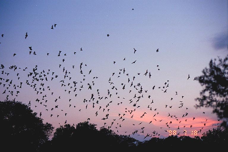This is a picture of the main emergence wave of bats flying up out of Bracken Cave off into the night sky, with a nice pink light reflecting off the clouds in the distance. I moved perpendicular to the stream of bats for this shot, over to one side of the sinkhole. Photo taken with a Canon Elan IIe camera on a Manfrotto Wilderness tripod with a 50mm f/1.8 lens, Kodak Royal Gold 400 film.