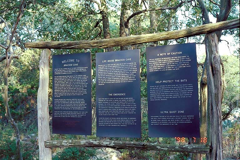 This is a picture of a welcome sign at the top of the trail leading to Bracken Cave, explaining some cave history and providing some etiquette tips. Photo taken with a Canon Elan IIe camera on a Manfrotto Wilderness tripod with a 50mm f/1.8 lens, Kodak Royal Gold 100 film.