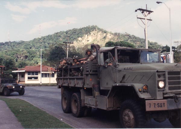 ![]() ![]() A truck full of American soldiers rumbles through the usually peaceful streets of Balboa. Right behind the camera is the destroyed police station seen in the other photos. Across the street is the YMCA. This is about half a mile from our house at the time. Ancon Hill with the large Panamanian flag is in the background. |