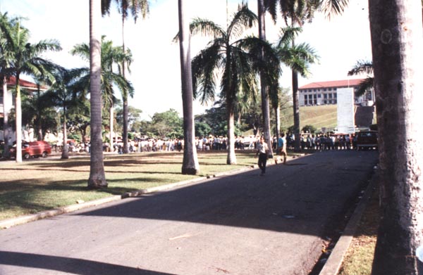 ![]() ![]() This is looking towards the Goethals Memorial and the Administration Building in downtown Balboa, with a group of homeless Panamanian refugees lining up to be housed in temporary shelter in the stadium at Balboa High School. |